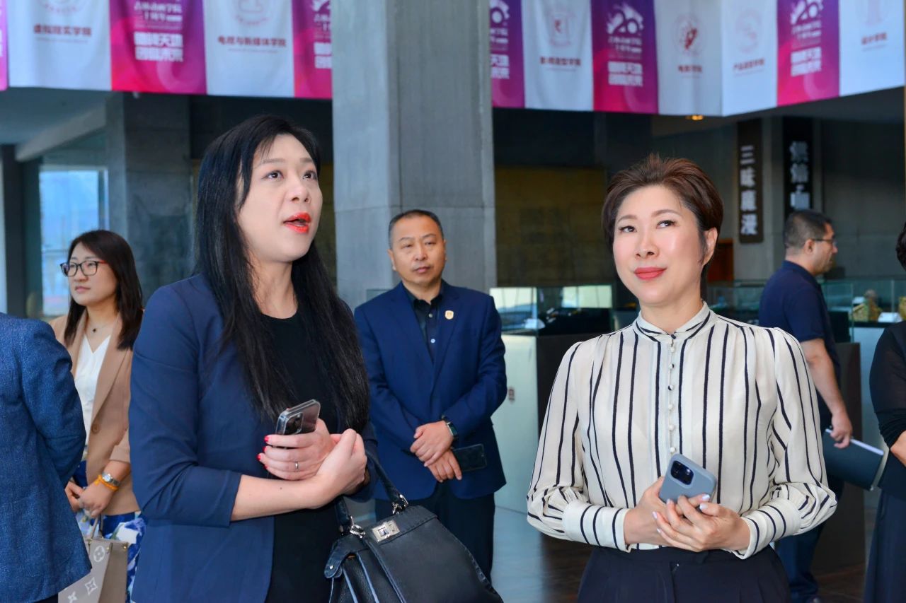 廖伊曼一行在刘振华、王晓岩的陪同下参观了我校的校史馆、博物馆以及学研产一体化成果展厅。嘉宾们详细了解我校发展历史,对我校23年来取得的成就表示赞誉;在博物馆内,看到如此多业界大咖的作品嘉宾们发出啧啧赞叹声;在学研产一体化成果展厅,对我校师生的真实作品给予了高度评价。