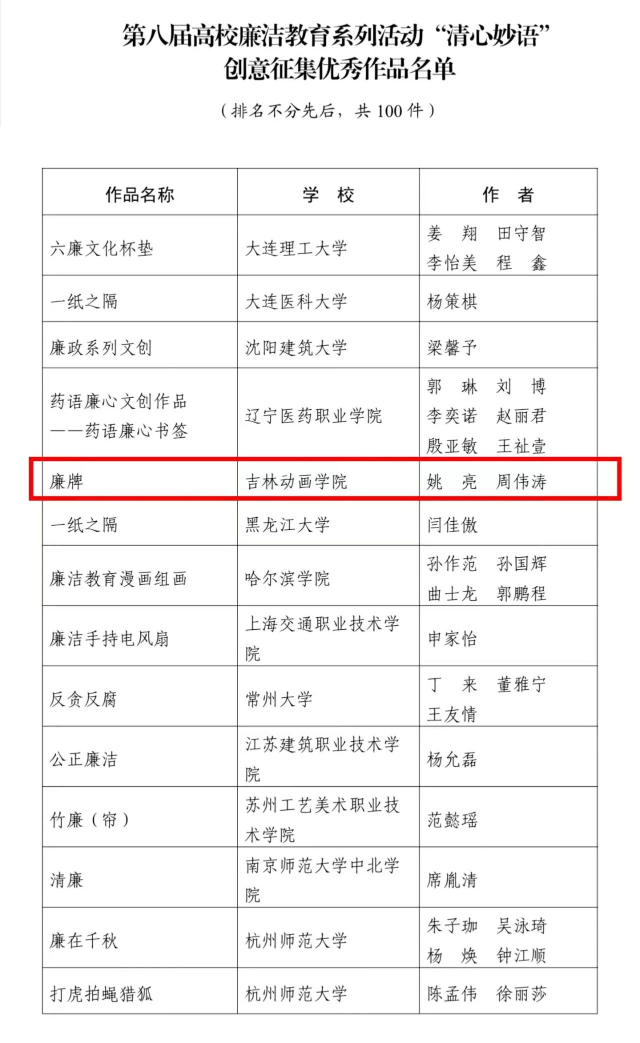 近日,教育部办公厅下发了“关于公布第八届高校廉洁教育系列活动结果的通知”。从通知中获悉,我校文化产业商学院学生姚亮、周伟涛凭借原创作品《廉牌》在“清心妙语”创意征集中成绩突出,获全国优秀作品百强奖项,擦亮青春底色,书写新时代“清廉答卷”。