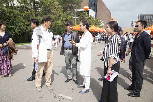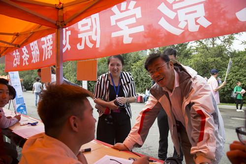 党委副书记、副校长岳学军和志愿者交流