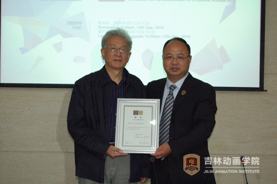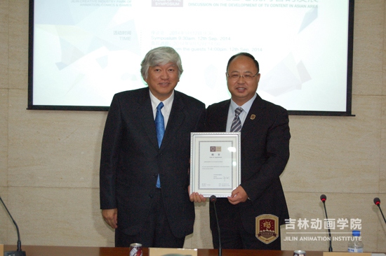 “亚洲下一代TV内容论坛”座谈会后,吉林动画学院董事长郑立国,为王占海、林健嗣、周建顺先生颁发了吉林动画学院客座教授聘书。