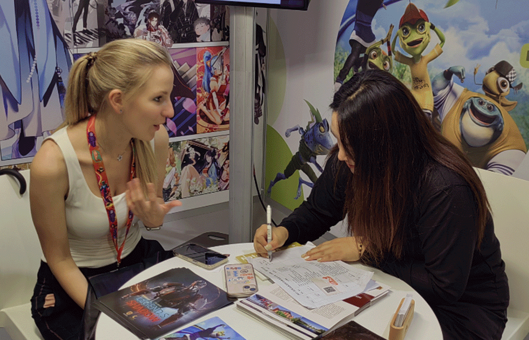 吉林动画学院展位迎来了英国、加拿大、马来西亚、澳大利亚、巴西、印度、爱尔兰、泰国等国际参展商驻足,就吉林动画学院原创IP《青蛙王国》系列电影发行及现有IP的联合制作展开交流,探讨未来合作可行性。