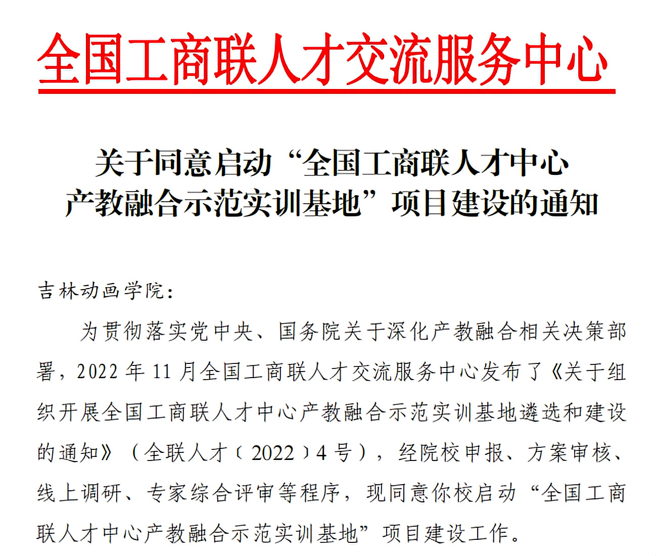 2022 年 11 月全国工商联人才交流服务中心发布了《关于组织开展全国工商联人才中心产教融合示范实训基地遴选和建设的通知》(全联人才﹝2022﹞4 号),经院校申报、方案审核、线上调研、专家综合评审等程序,吉林动画学院正式获批“全国工商联人才中心产教融合示范实训基地”。
