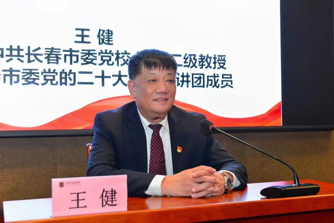 王健教授以《扎实抓好主题教育 为奋进新征程凝心聚力——深入学习习近平新时代中国特色社会主义思想》为题,从开展主题教育的重要意义、基本要求和习近平新时代中国特色社会主义思想体系框架及主旨主线三个方面,进行了深入、系统、全面的讲解。他表示,这次主题教育要牢牢把握“学思想、强党性、重实践、建新功”的总要求,“立德树人”是高等学校教书育人最本质的工作,更是高校党的建设和思想政治工作的根本任务,要引导学生把爱党之情、报国之志融入到筑梦、追梦、圆梦的宏伟事业之中。我们必须贯彻党的教育方针,加强高校党的建设,坚持用新时代中国特色社会主义思想铸魂育人,全面提升中国特色社会主义高校育人育才的水平。