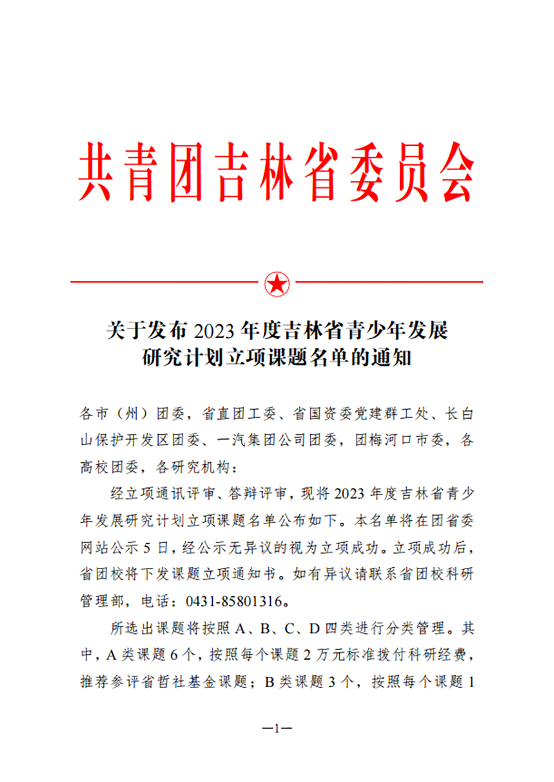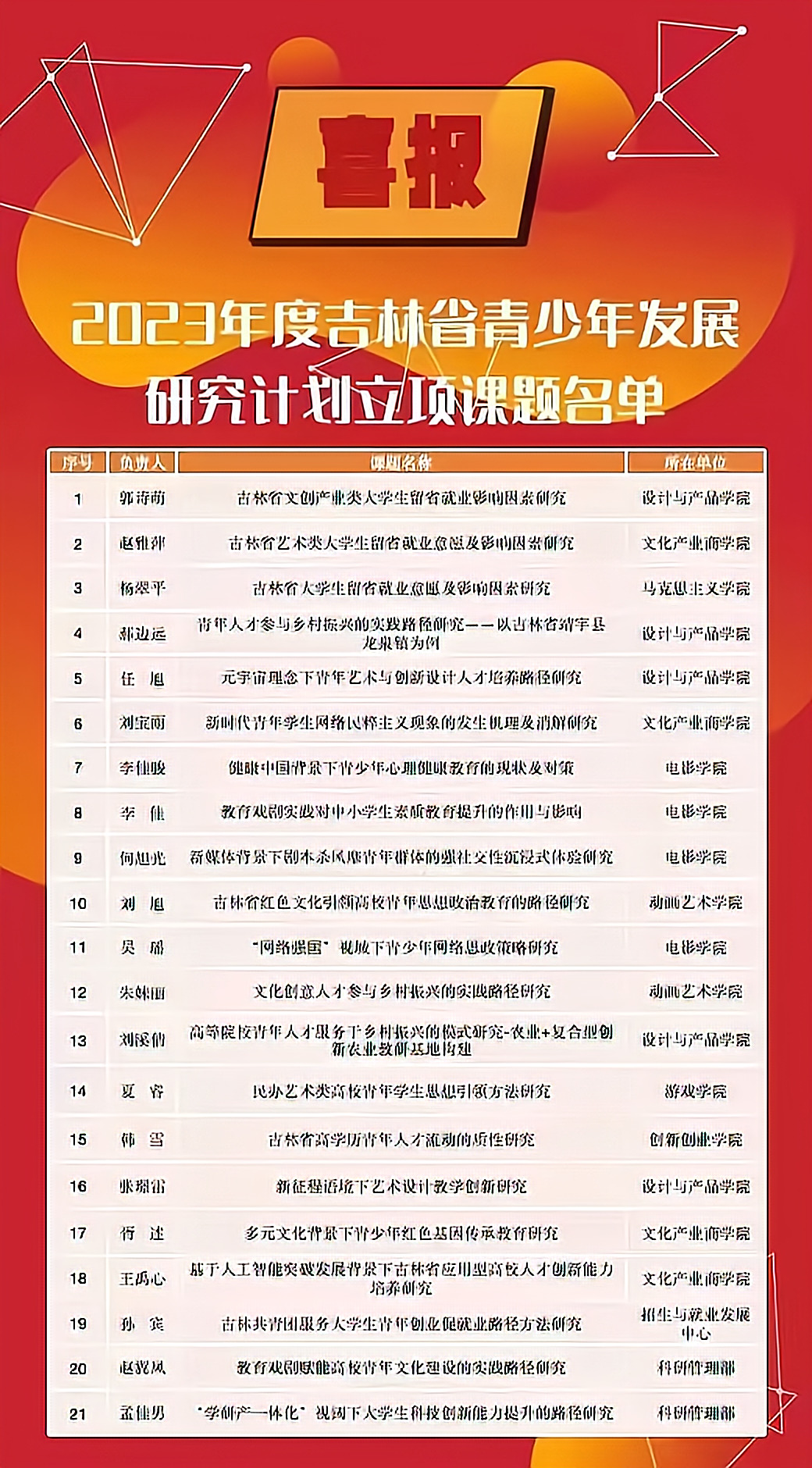 近日,共青团吉林省委员会下发《关于发布2023年度吉林省青少年发展研究计划立项课题名单的通知》,我校共有21项课题获批一般项目立项,获批项目总数创我校该课题立项总数的历史新高。