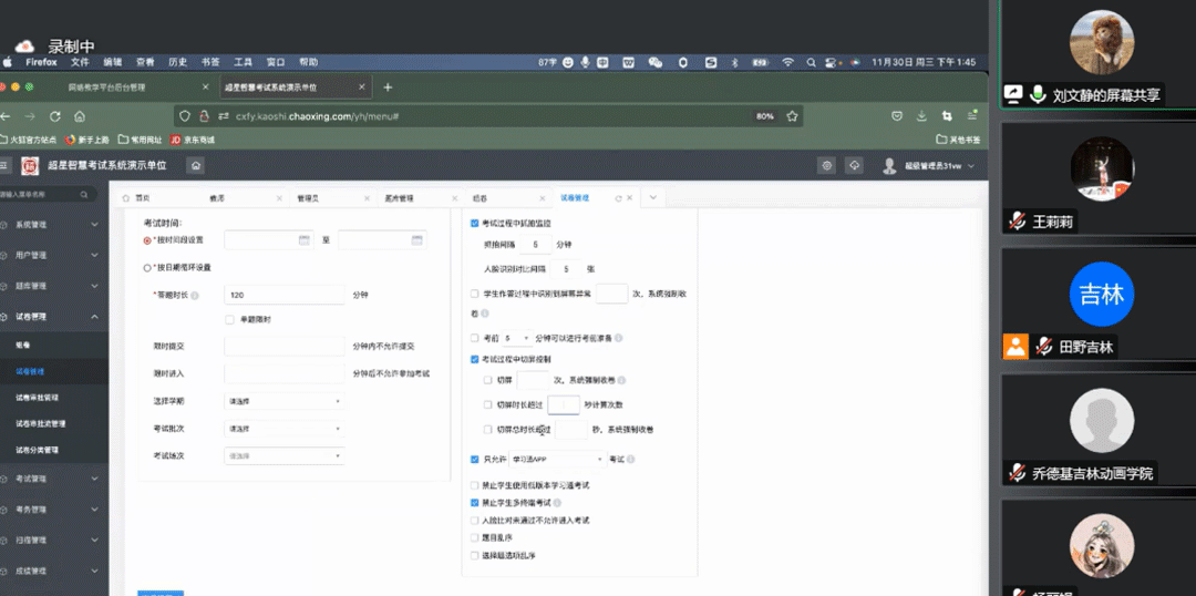 为实现平安考试目标,学校成立了校院两级线上考试工作领导小组,统筹各项工作。教务部下发了《吉林动画学院2022-2023学年第一学期期末线上考试工作方案》,从试卷命题、组织安排、试卷评阅、成绩录入、材料归档等环节入手,规范了期末考试的全过程管理。教学单位一院一案,在学校考试工作方案的基础上,有针对性地细化了学院方案,编制了流程,组织了演练,明确了责任,确保考试的有序实施。