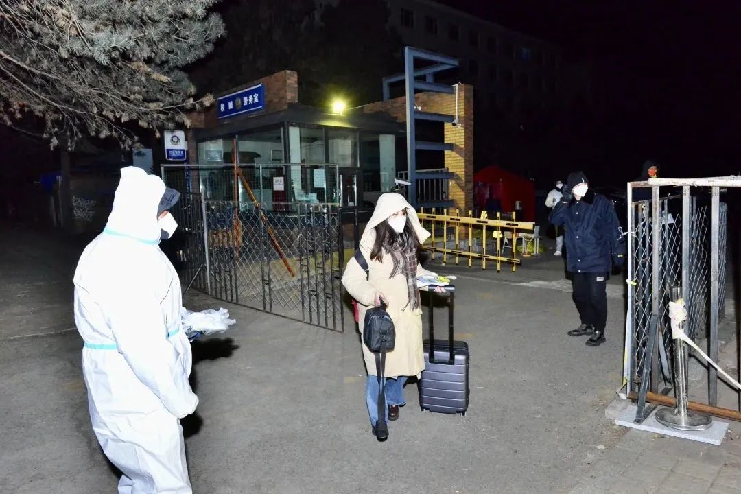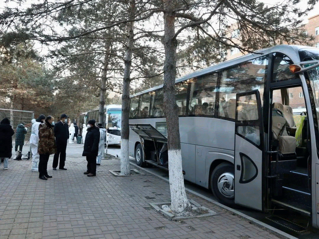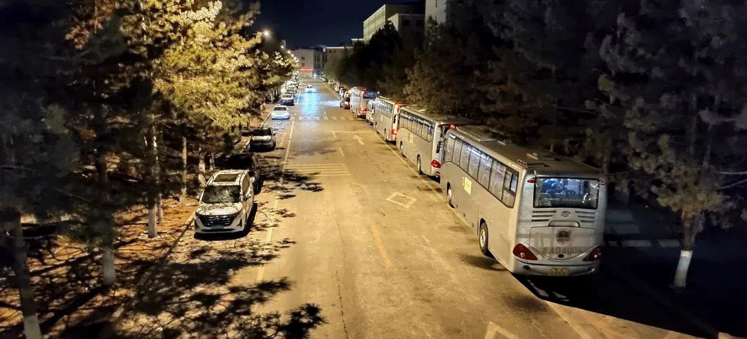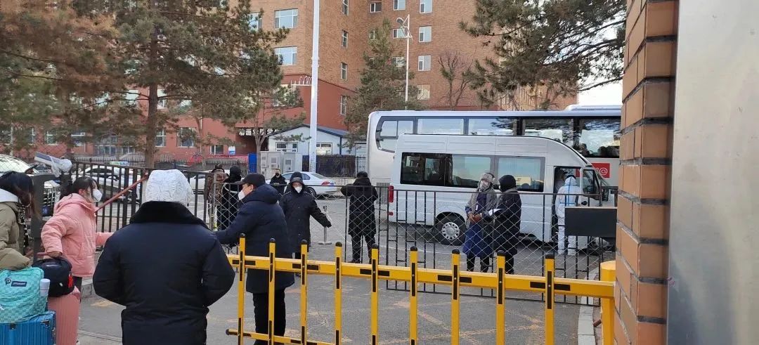 工作组每天4点天不亮就起床,顶着零下十几度的严寒天气,做车辆调度、发放防疫包、早餐包、开具离校返乡《无疫情证明》、协助快递邮寄等准备工作;校门内外值班老师无接触情况下逐一核对名单、核酸和航班车次,确保5:30,第一班发往“三站一场”班车准时发出。