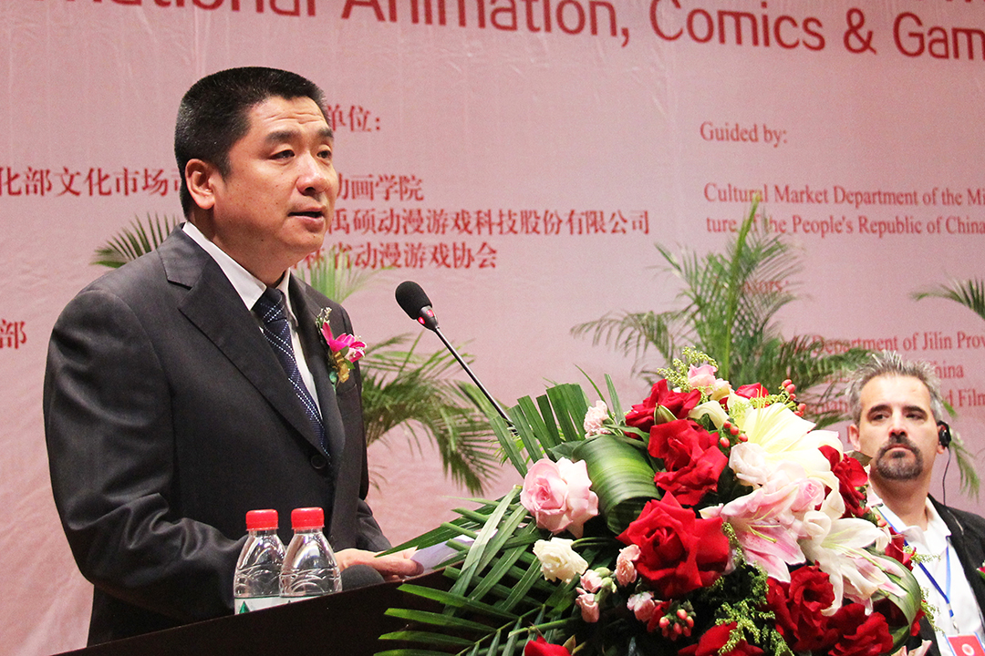 国家文化部文化市场司处长李建伟,中共吉林省委宣传部副部长许云鹏,吉林省教育厅厅长卢连大,国际动画协会会长尼尔森•申,美国动视暴雪公司总监肯尼斯•罗斯曼在开幕式上致辞。