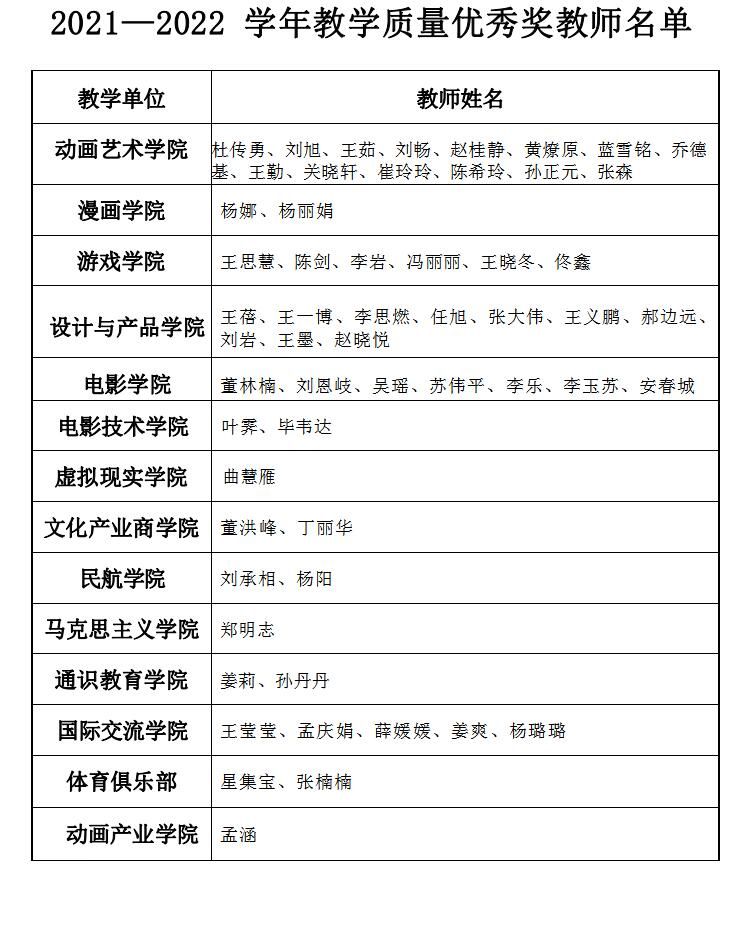 根据教师课堂教学质量综合评价、教师教学水平考核、教师教学获奖情况,通过基层推荐、评选小组综合评估,授予杜传勇等57名教师“2021—2022 学年教学质量优秀奖教师”称号。