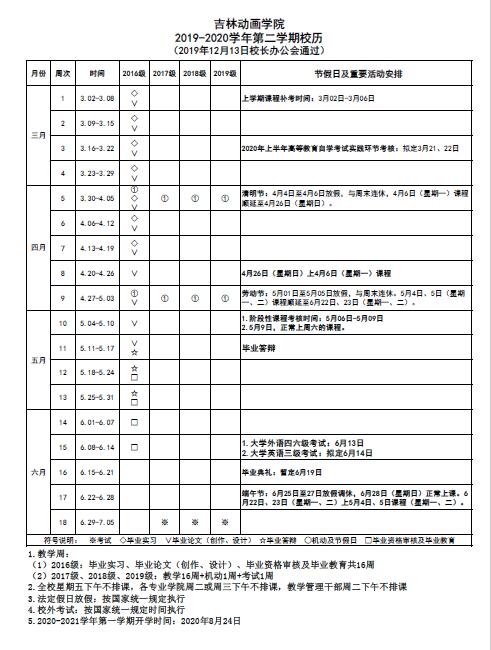 吉林动画学院 2019-2020学年第二学期校历
