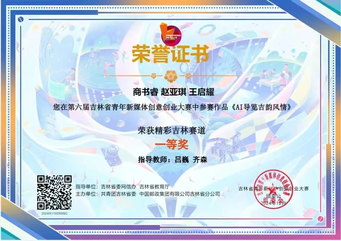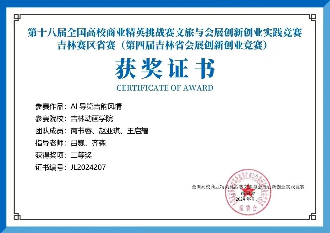 2024年秋季,团队立足吉林本土文化特色,聚焦地域文旅资源开展专项创作,历经三个月精心打磨,正式推出《AI导览吉韵风情》系列作品,依托AIGC技术精准还原吉林特色风貌,生动呈现长白山天池雪域盛景、延吉朝鲜族民俗风情等经典画面,成功突破AI技术与文旅场景深度融合的关键难题。凭借优质的内容与创新的形式,该作品先后斩获吉林省青年新媒体创意创业大赛等省级大赛一等奖等多项荣誉。