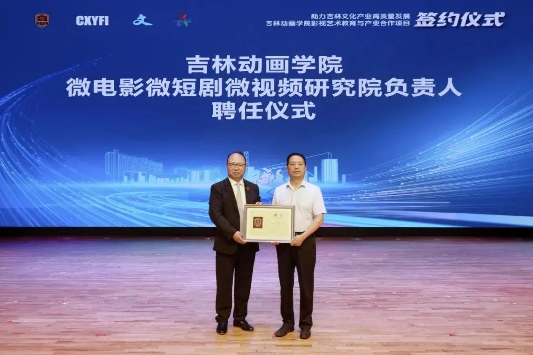 会上宣读了在中国夏衍电影学会指导支持下,《关于成立吉林动画学院微电影微短剧微视频研究院暨聘任负责人的决定》,相关领导共同为“吉林动画学院微电影微短剧微视频研究院”揭牌以及颁发聘书。