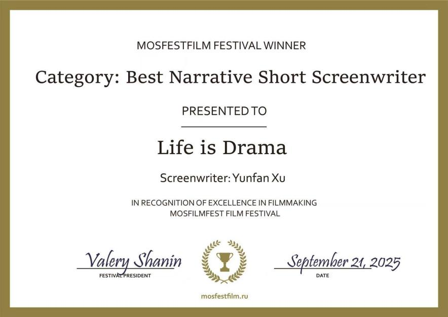 《大圣》获莫斯电影节“最佳短片编剧奖”证书