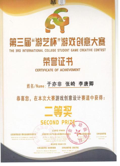 在第四届“游艺杯”游戏创意大赛,“天池奖”第五届吉林省大学生广告创意大赛,清华艺科创意工坊第五期,以及全球数字艺术创新创业大赛游戏设计与开发实践公开赛等赛事,均取得优异成绩。